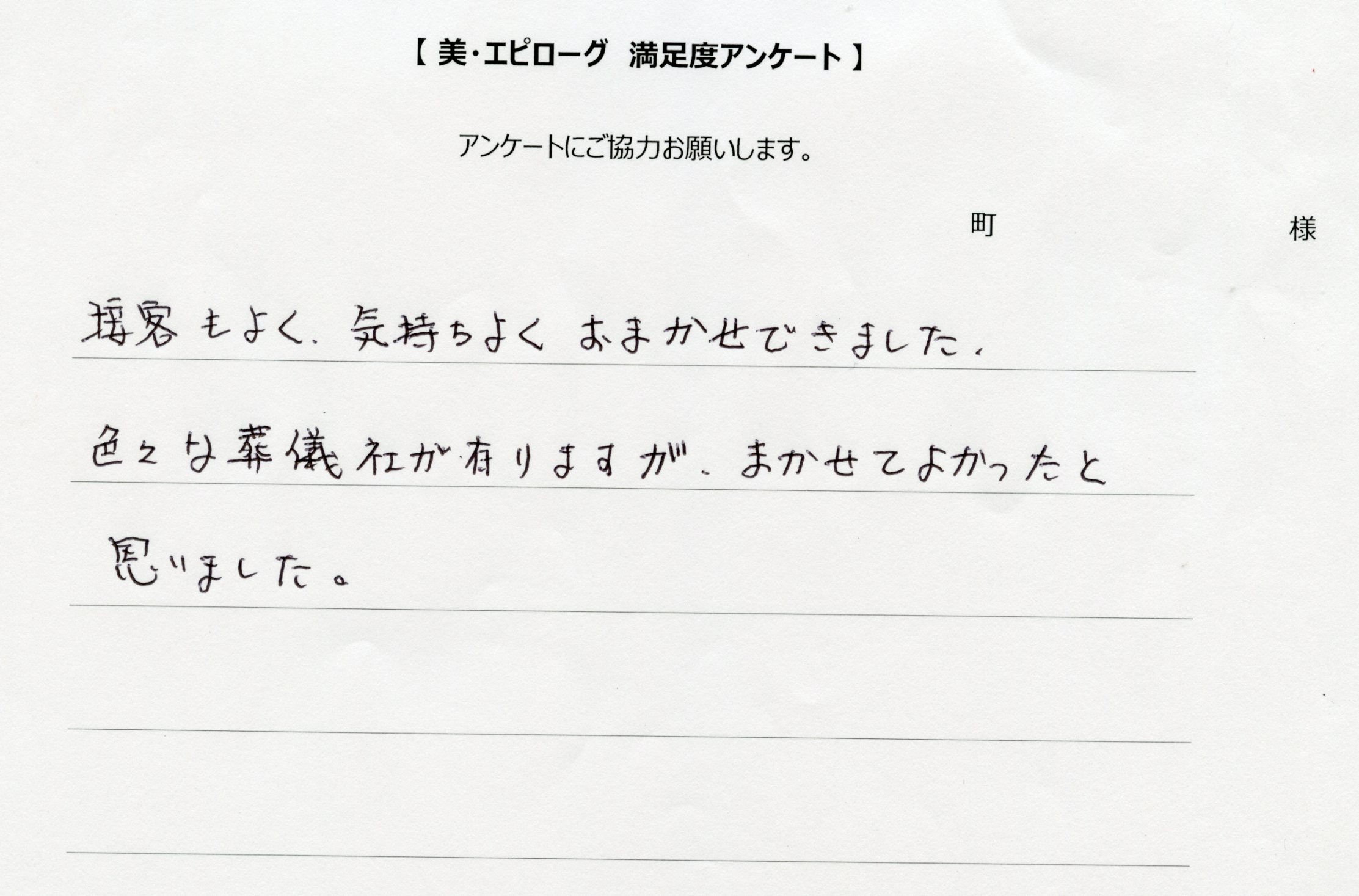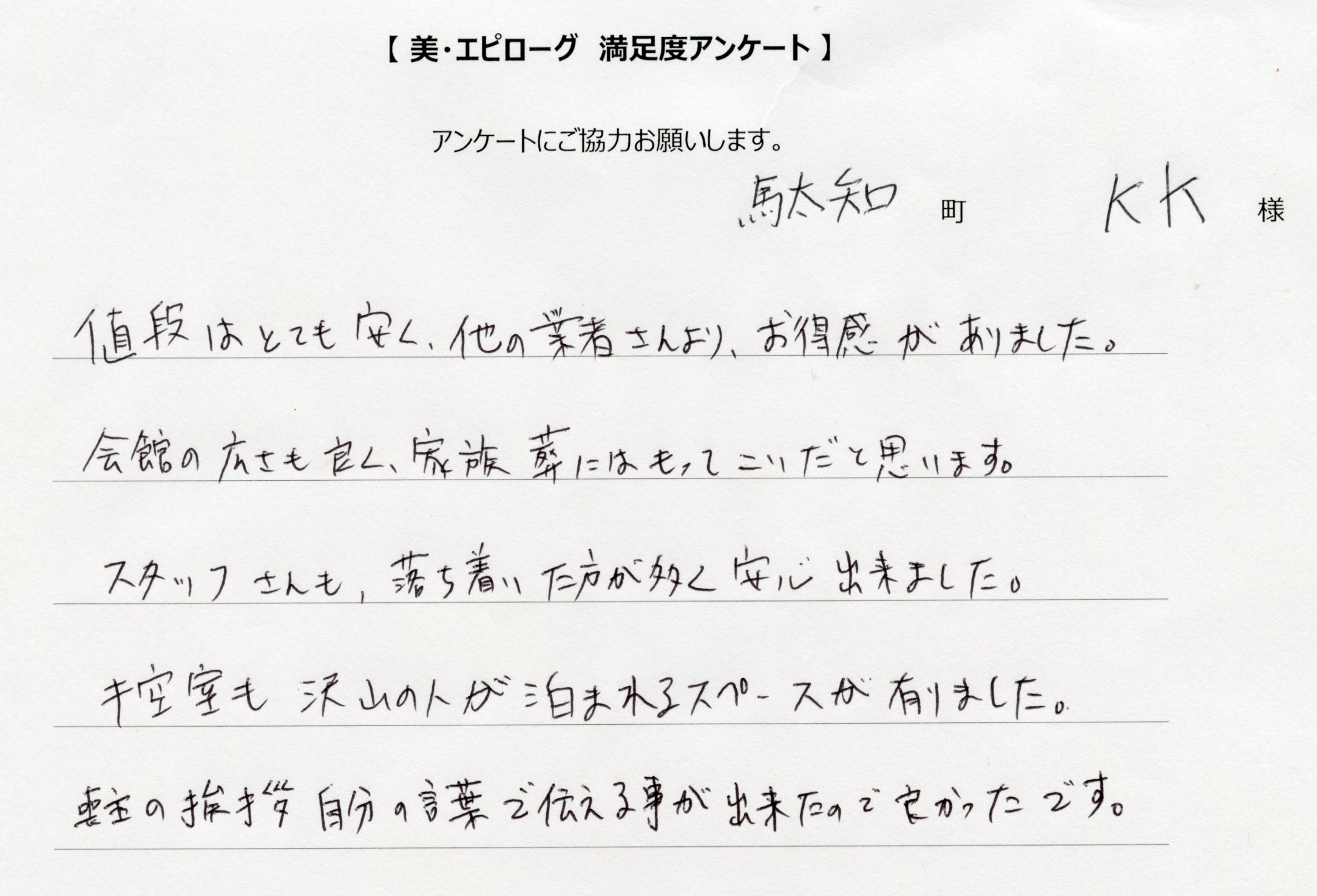 ホーム > お客様の声 2025年12月現在 1531人様のご感想を更新中です! 多治見の家族葬専門式場、美・エピローグ【かぞく別館】でご葬儀をいただいたお客様からの貴重なご感想を掲載しています。多治見市での家族葬をお考えの方に参考となる声を多数いただいております。 不安だった私達も安心してお任せする事が出来ました 接客もよく、気持ちよくおまかせできました 以前母を見送った時とてもよかったので、またお願いしました とてもステキな祭壇でお見送りする事が出来ありがとうございました 会館の広さも良く、家族葬にはもってこいだと思います 23 / 307« 先頭«...10...2122232425...304050...»最後 » SHARE→
