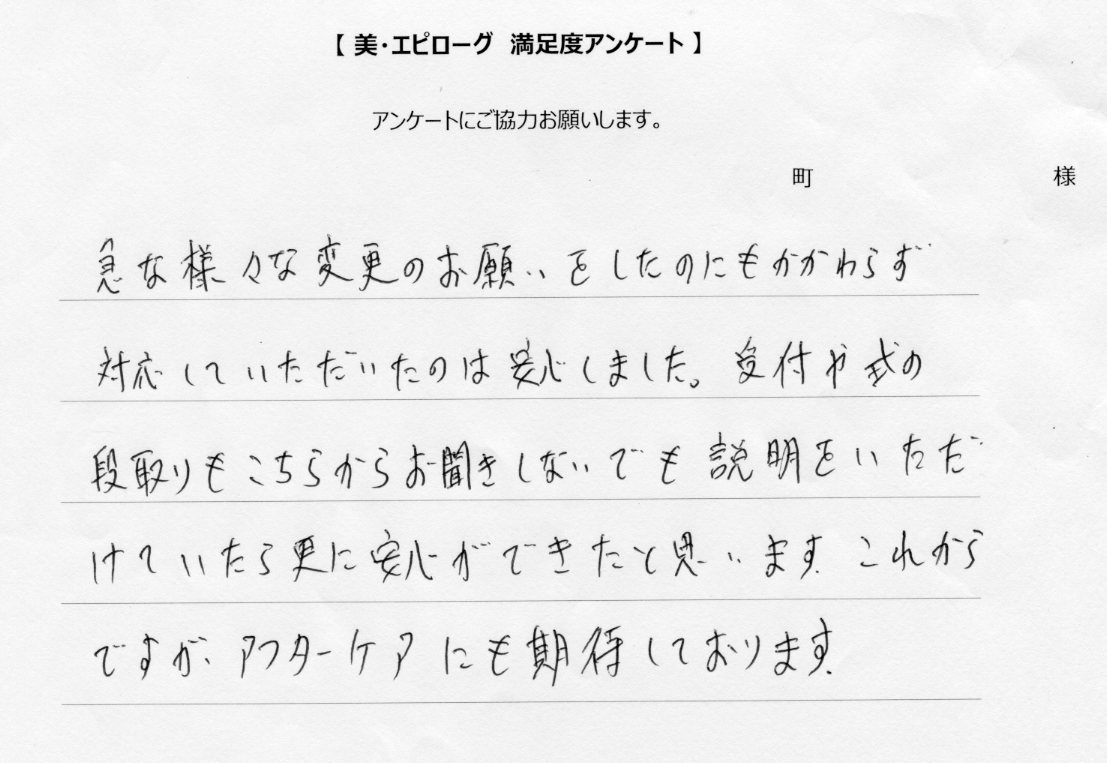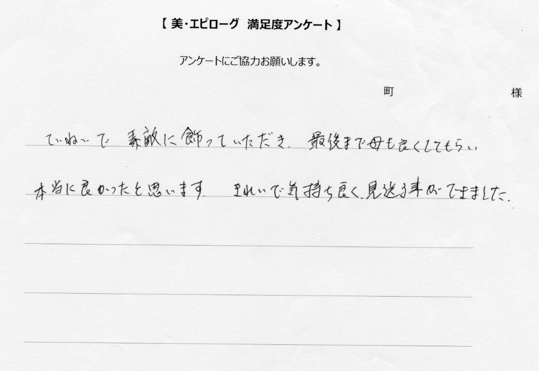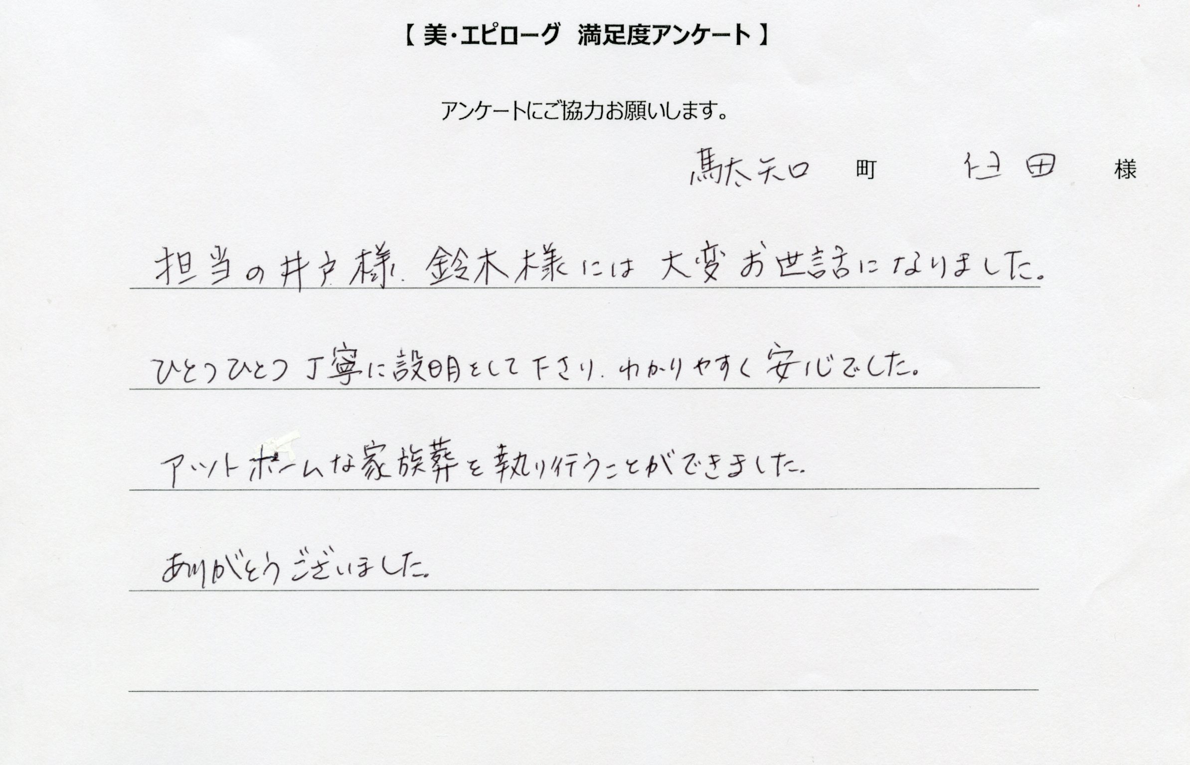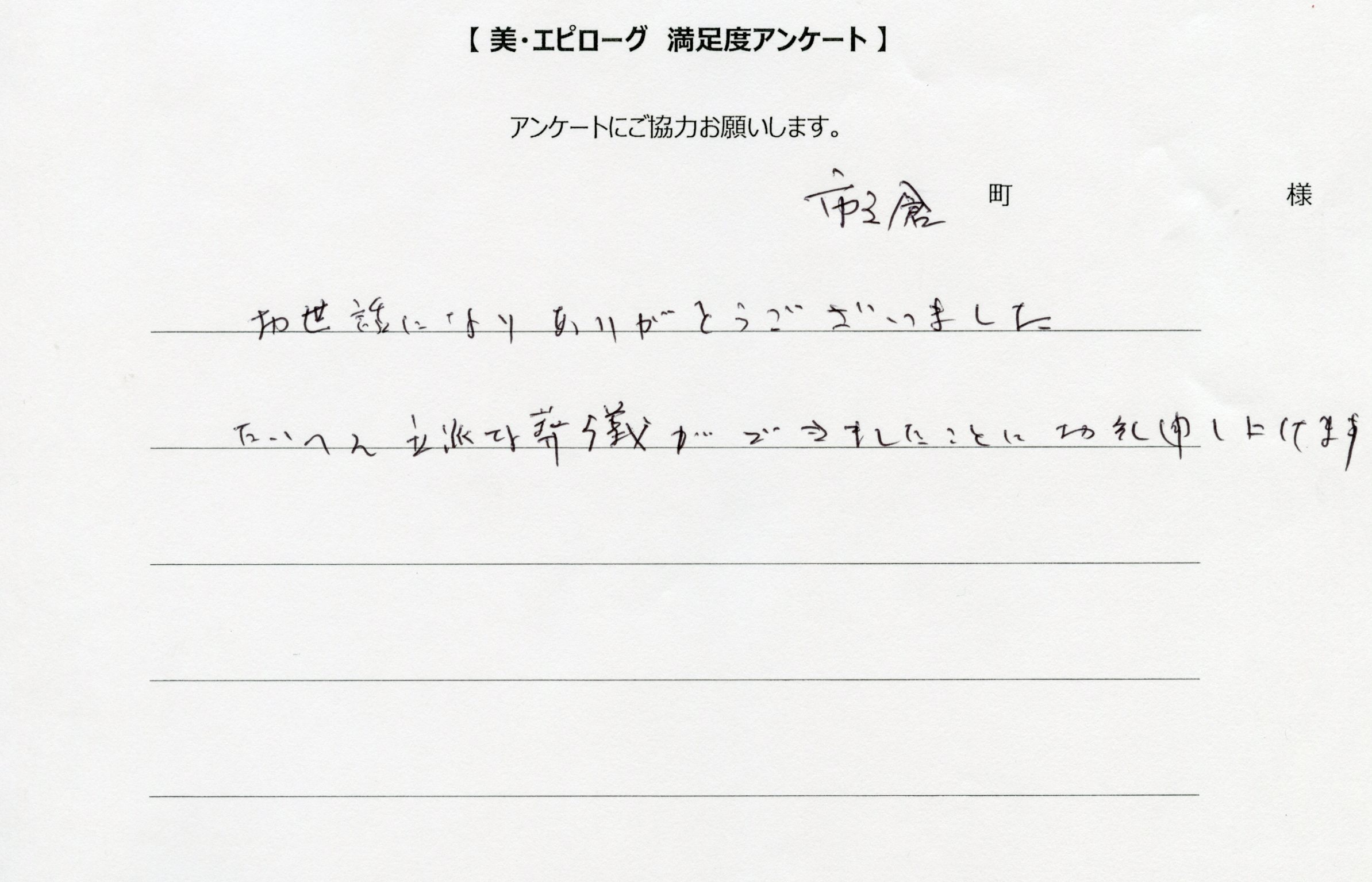 ホーム > お客様の声 2025年12月現在 1531人様のご感想を更新中です! 多治見の家族葬専門式場、美・エピローグ【かぞく別館】でご葬儀をいただいたお客様からの貴重なご感想を掲載しています。多治見市での家族葬をお考えの方に参考となる声を多数いただいております。 きれいで気持ち良く見送ることができました 心から感謝しております 急な変更に対応していただいたのは安心しました ご丁寧に教えて頂き大変助かりました 心よく対応して下さりありがたかったです 9 / 307« 先頭«...7891011...203040...»最後 » SHARE→